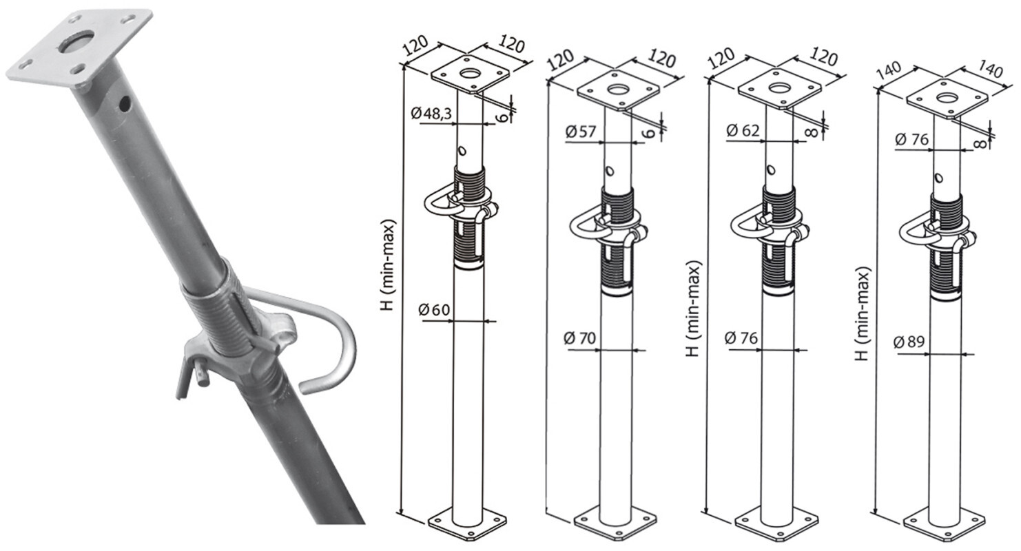 nach Größe 57 bis 76 mm, Außenrohr: je nach Größe 70 bis 89 mm, Kopf- und Fußplatten: 120x120x6 mm. Deckenstütze Klasse D, feuerverzinkt, Außengewinde, Bruchlast: 37,60-