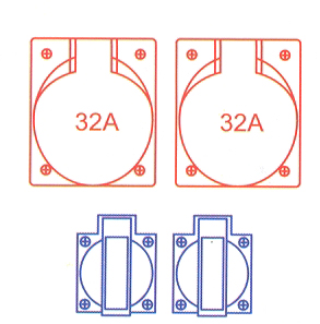 Eingang: CEE-Gerätestecker 32 A 5p 400 V. Ausgang: 2 CEE-Steckdosen 32 A 5p 400 V ungesichert, 2 SK-Steckdosen 16 A 250 V IP 54 abgesichert ü. 1 LS 16 A 1p C. Leitungsschutzschalter.
