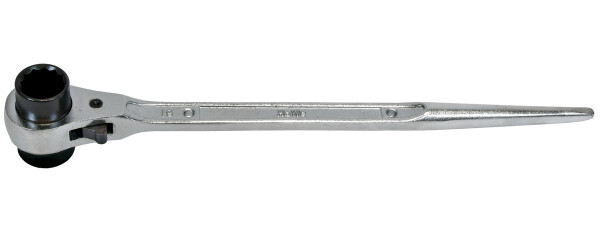 Robuste Ausführung aus Chrom-Vanadium-Stahl. Spitzer Griff zum Eindrehen der Gerüstösenschrauben. Feste Doppelnuss mit Schlüsselweite 19 und 22 mm. Öl-Loch am Ratschenzahnrad. Länge 31 cm.